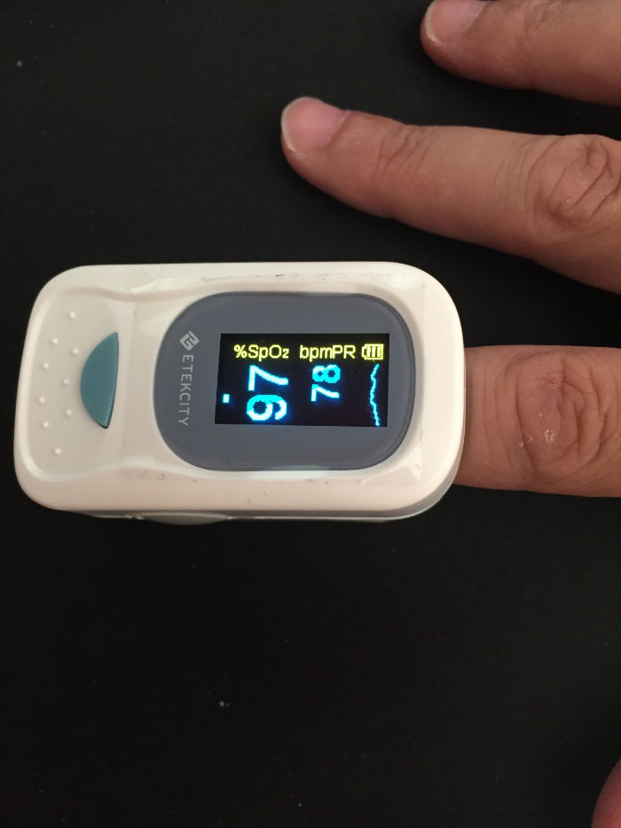 Nunca había sido tan sencillo controlar tu saturación de oxigeno y el pulso en casa. Lo entiendes, te lo pones en el dedo y automáticamente comienza la medición. En unos 5-10 segundos aparecen los resultados en pantalla y como podéis ver en las fotos van cambiando en función del aumento de mi pulso (me he puesto a respirar más rápidamente).