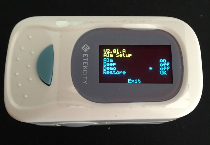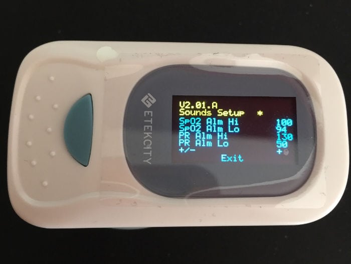 Si dejas apretado el botón del oxímetro, entras en el menú de configuración donde se pueden cambiar los valores máximos y mínimos del pulso y de la concentración de oxigeno para que salte la alarma. También se puede restaurar el dispositivo y encender el beep. Se apaga solo después de usarlo.