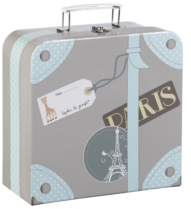 Este kit de regalo viene con la jirafa de siempre, y además incluyen una toalla 100% algodón de 30 x 30 cm con el dibujo de la jirafa y una preciosa maleta decorada con motivos de París en azul cielo y gris, y una especie de «tag» donde podemos poner el nombre del recién nacido.